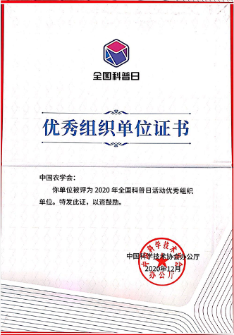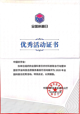 圖2 2020年全國科普日優(yōu)秀活動(dòng)證書——全國科普日農(nóng)村科普聯(lián)合行動(dòng)暨中國農(nóng)學(xué)會(huì)科技志愿者服務(wù)基層行活動(dòng)