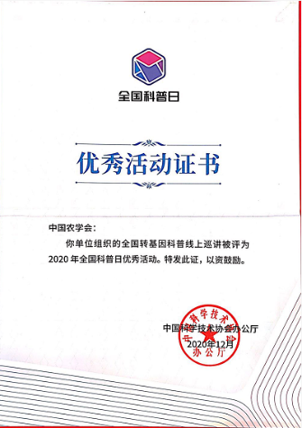 圖3 2020年全國科普日優(yōu)秀活動(dòng)證書——全國轉(zhuǎn)基因科普線上巡講